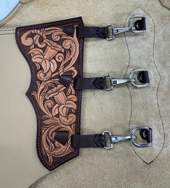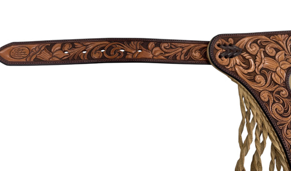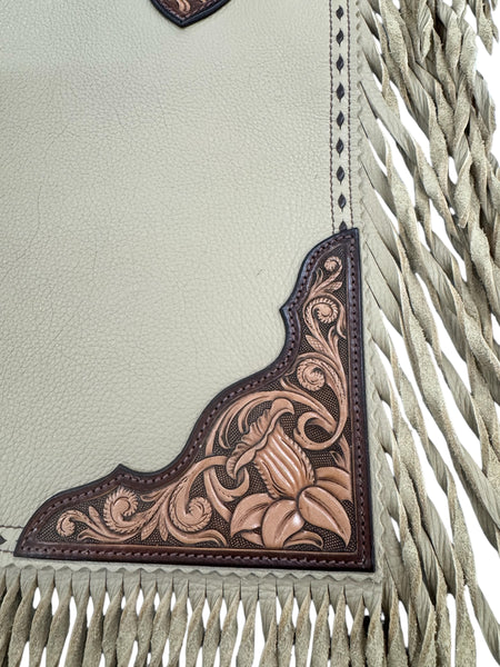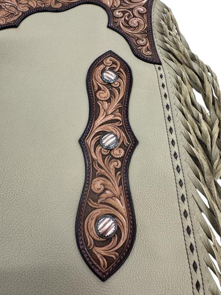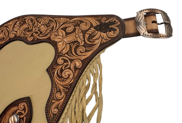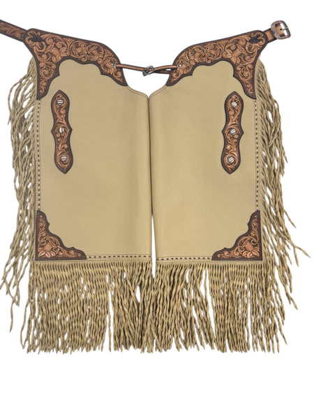 Beautiful butter coloured chap leather. Fully carved yokes, side panels, leg panel, leg reinforcement and belt. Twisted fringe, buckstitching detail, Horseshoe brand hardware, clips for leg closure
